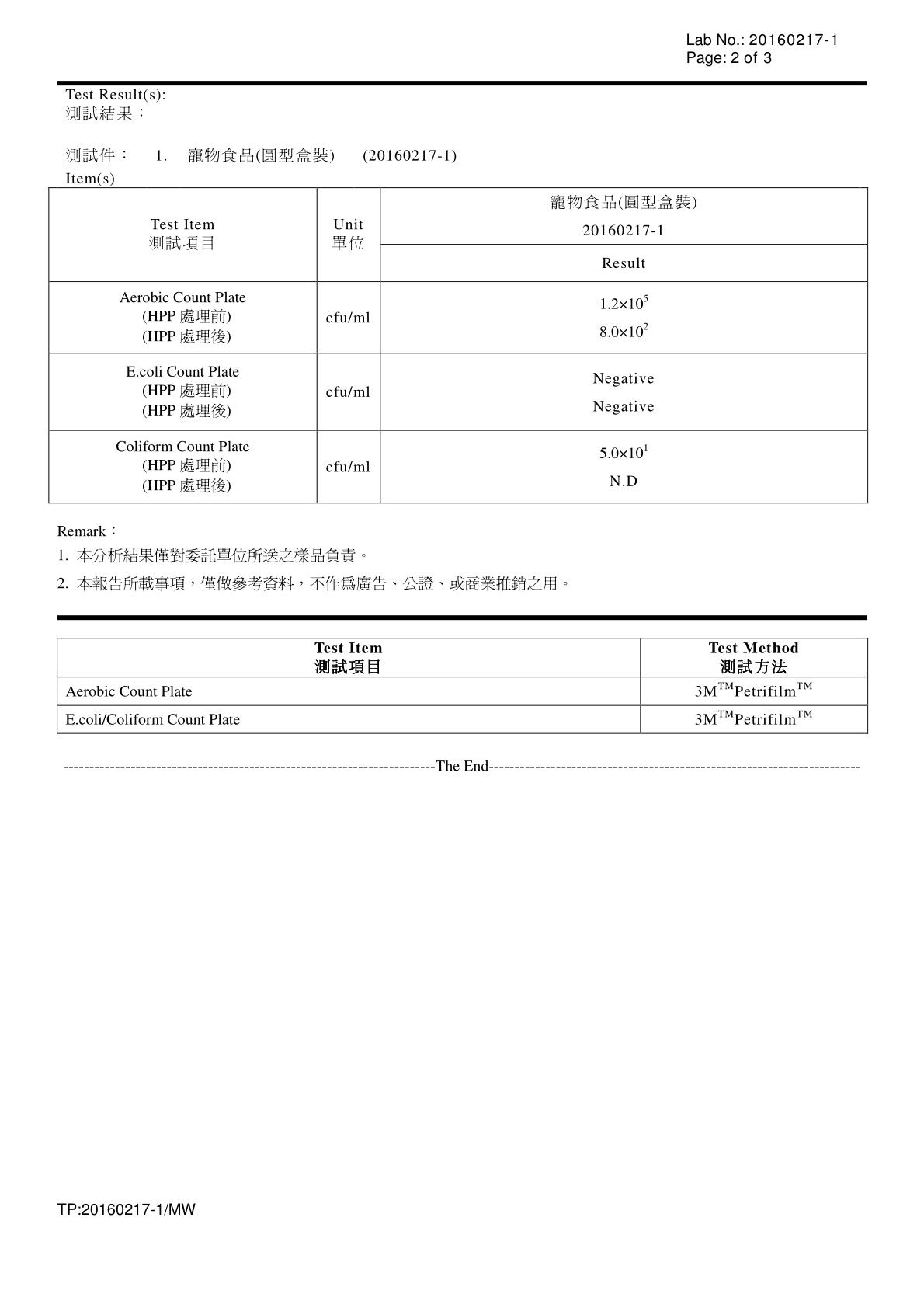 卡尼生肉主食經高壓殺菌前後生菌數檢測