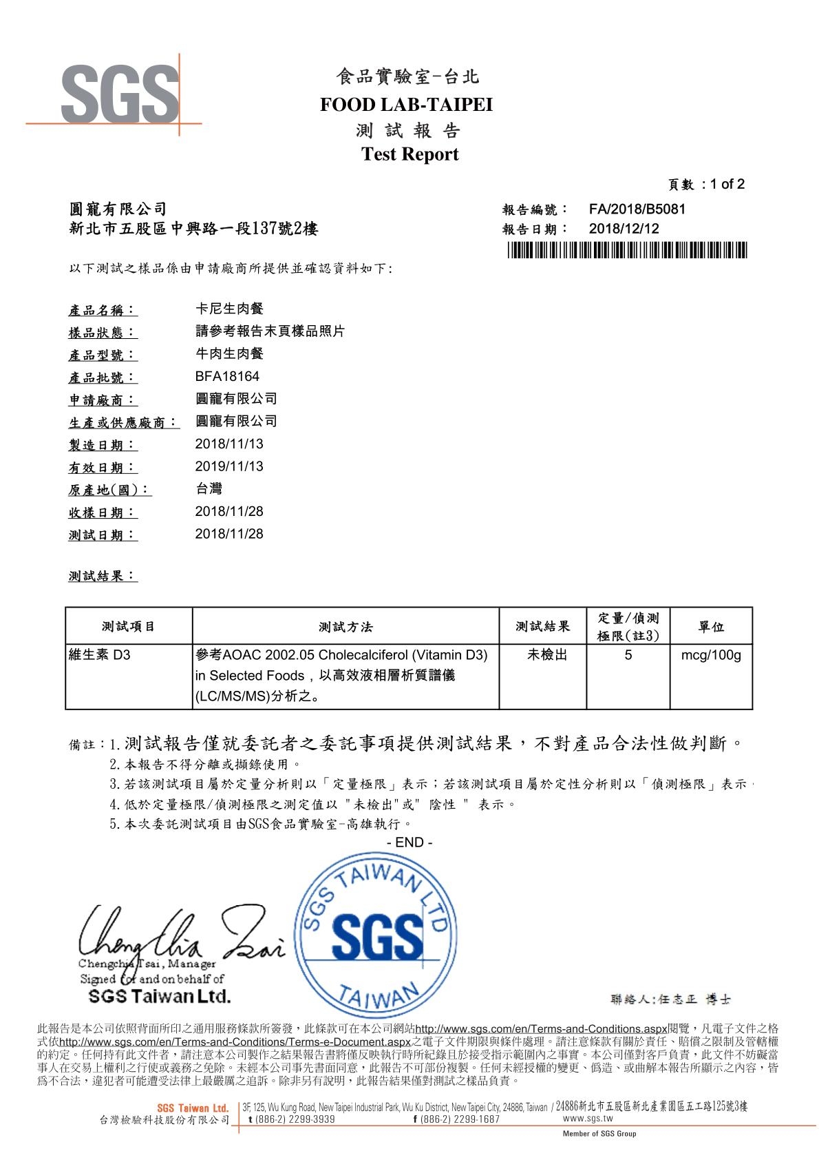 另因卡尼生肉餐超過99%為動物性成分且未額外添加維生素D,因此依實驗室建議僅檢驗維生素D3而不檢驗維生素D2。